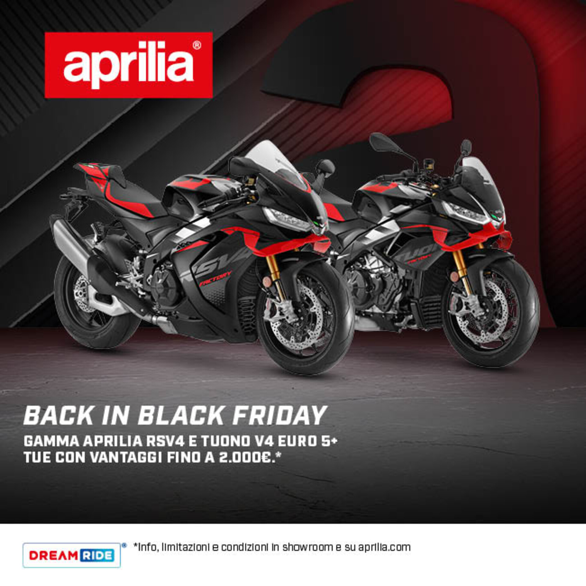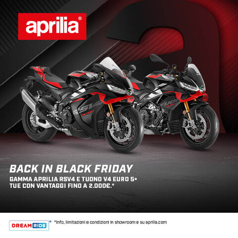 *Offerta valida sul prezzo di listino consigliato franco concessionario per veicoli immatricolati dal 01/08/2025 al 31/10/2025 presso la rete di vendita ufficiale Aprilia che aderisce all’iniziativa. La promozione prevede i seguenti vantaggi: 2.000€ su RSV4 Factory Euro 5+, 1.500€ su RSV4 e Tuono V4 Factory, 1.000€ su Tuono V4 Euro 5+ riconosciuti attraverso varie possibilità, anche combinate tra loro, come ad esempio sconto sull’acquisto di accessori, abbuono delle spese di immatricolazione, assicurazione compresa nel prezzo f.c consigliato del veicolo, contributo sul prezzo f.c consigliato di Aprilia RSV4 e Tuono V4 Euro5+. Non cumulabile con eventuali ulteriori promozioni proposte dal concessionario.
