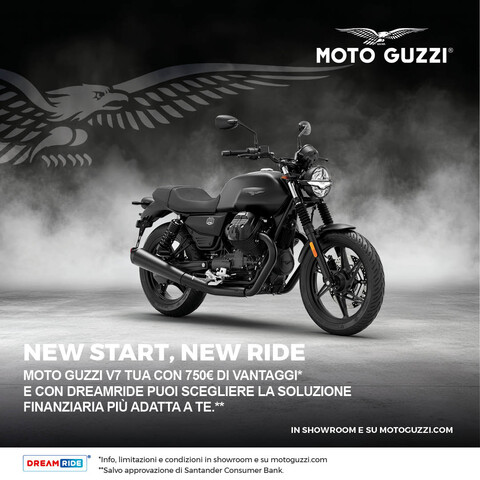 *Offerta valida sul prezzo di listino consigliato franco concessionario per veicoli immatricolati dal 01/02/2026 al 28/02/2026 presso la rete di vendita ufficiale Moto Guzzi che aderisce all’iniziativa. La promozione prevede 750€ di bonus riconosciuti attraverso varie possibilità, anche combinate tra loro, come ad esempio contributo sul prezzo f.c consigliato della gamma Moto Guzzi V7 Euro5+, sconto sull’acquisto di accessori, abbuono delle spese di immatricolazione, assicurazione compresa nel prezzo f.c consigliato del veicolo. La promozione non si applica alla versione V7 Sport. Non cumulabile con eventuali ulteriori promozioni proposte dal concessionario.