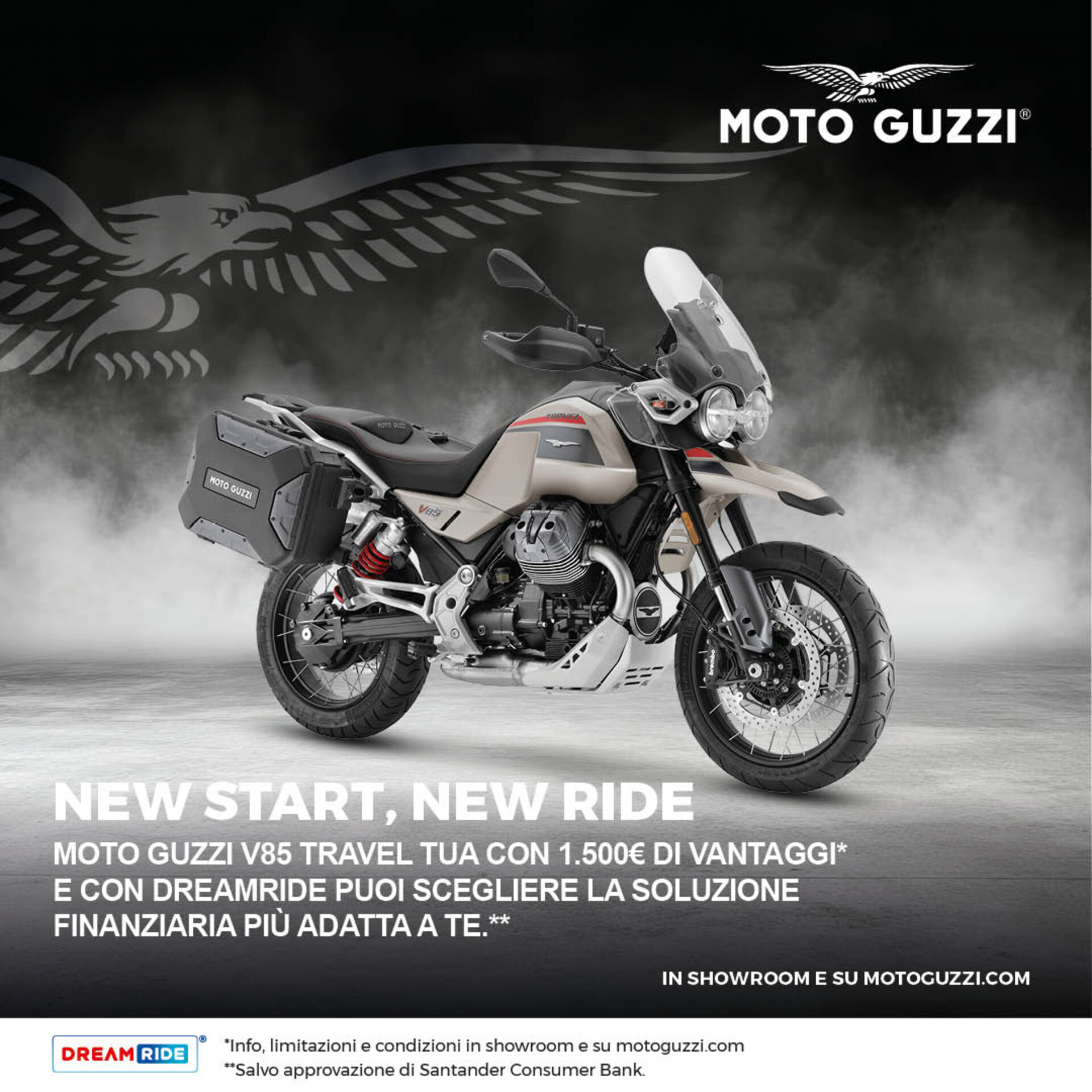 *Offerta valida sul prezzo di listino consigliato franco concessionario per veicoli immatricolati dal 01/03/2026 al 31/03/2026 presso la rete di vendita ufficiale Moto Guzzi che aderisce all’iniziativa. La promozione prevede per V85 Travel 1.500€ di bonus riconosciuti attraverso varie possibilità, anche combinate tra loro, come ad esempio contributo sul prezzo f.c consigliato di V85 Travel Euro 5+, sconto sull’acquisto di accessori, abbuono delle spese di immatricolazione, assicurazione compresa nel prezzo f.c consigliato del veicolo. Non cumulabile con eventuali ulteriori promozioni proposte dal concessionario.