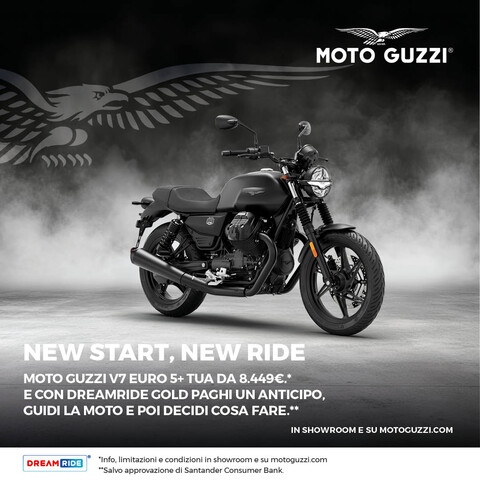 Annuncio pubblicitario con finalità promozionale. Esempio di finanziamento: MOTO GUZZI V7 850 Stone Abs my25 Prezzo € 9.199,00, anticipo € 749,00; importo totale del credito € 8.450,00, da restituire in 35 rate mensili ognuna di € 149,10, ed un VFG pari alla maxi rata finale di € 4.415,52, importo totale dovuto dal consumatore € 9.794,64. TAN 4,98 % (tasso fisso) - TAEG 7,13 % (tasso fisso). Spese comprese nel costo totale del credito: interessi € 984,02, istruttoria € 200,00, incasso rata € 3,75 cad. a mezzoSDD, produzione e invio lettera conferma contratto € 1.00; comunicazione periodica annuale € 1,00 cad.; imposta sostitutiva (o imposta di bollo): € 21,62. Offerta valida presso i dealers aderenti, fino al 31/01/2026. Condizioni contrattuali ed economiche in "Informazioni Europee di Base sul Credito ai Consumatori" presso la rete di vendita e sul sito www.santanderconsumer.it, sez. Trasparenza. Salvo approvazione di Santander Consumer Bank.