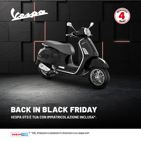 *Offerta valida per veicoli immatricolati dal 01/04/2025 al 31/10/2025 sul prezzo di listino consigliato franco concessionario presso la rete ufficiale Vespa che aderisce all’iniziativa. La promozione prevede l’immatricolazione inclusa nel prezzo sulla gamma Vespa GTS Euro 5+ riconosciuta al cliente come un contributo di 250€ sul prezzo f.c consigliato del veicolo, basato su importo medio nel territorio italiano. Eventuali costi aggiuntivi imputabili al costo d’immatricolazione specifico di alcune zone, saranno a carico del cliente. Non cumulabile con eventuali ulteriori promozioni presenti dal concessionario.